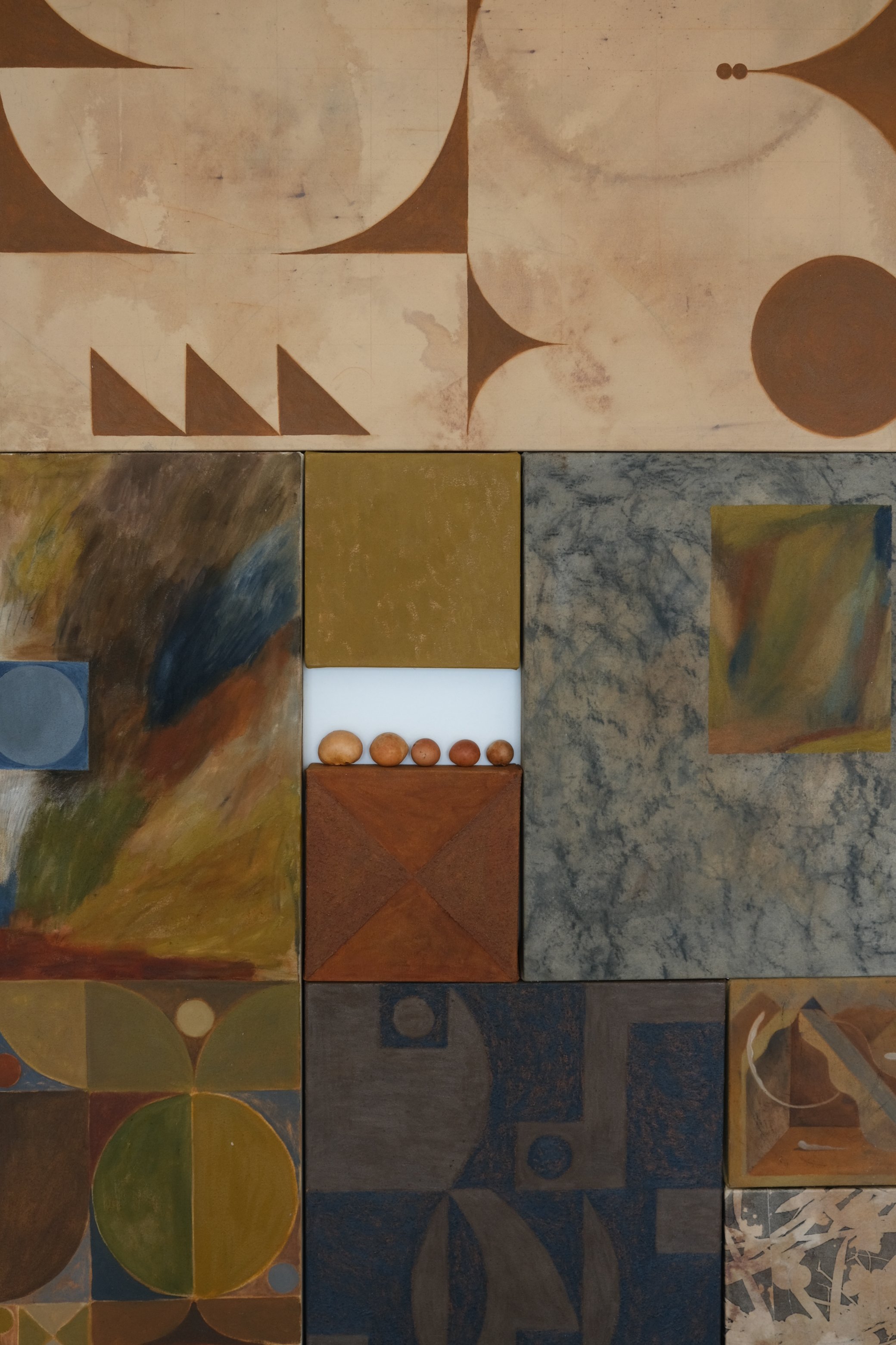 Oil, Graphite, Wax, Photo-Transfer, Pigment, Sand, Ceramics, Oak Gall, and Charcoal on Canvas and Jute