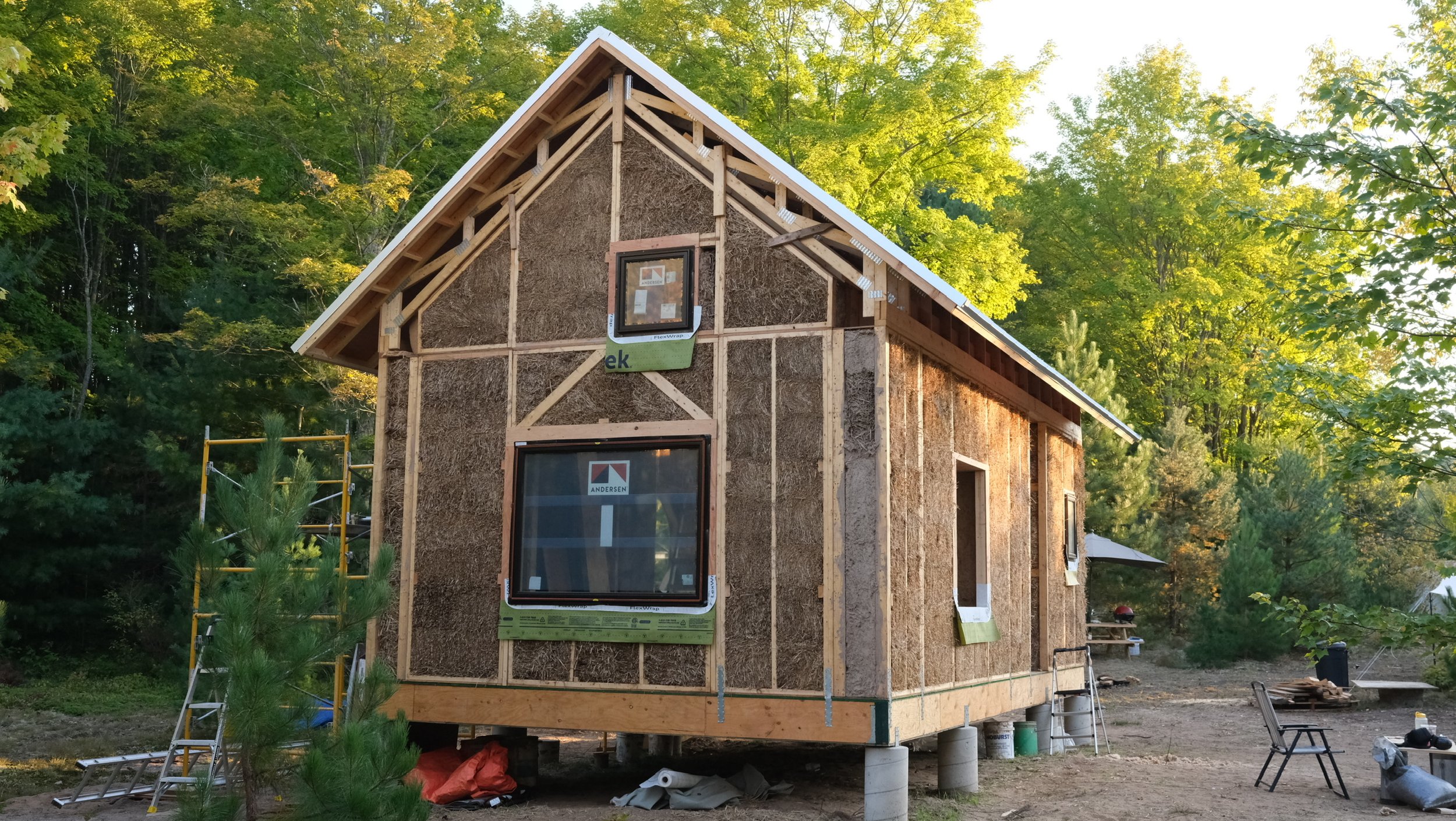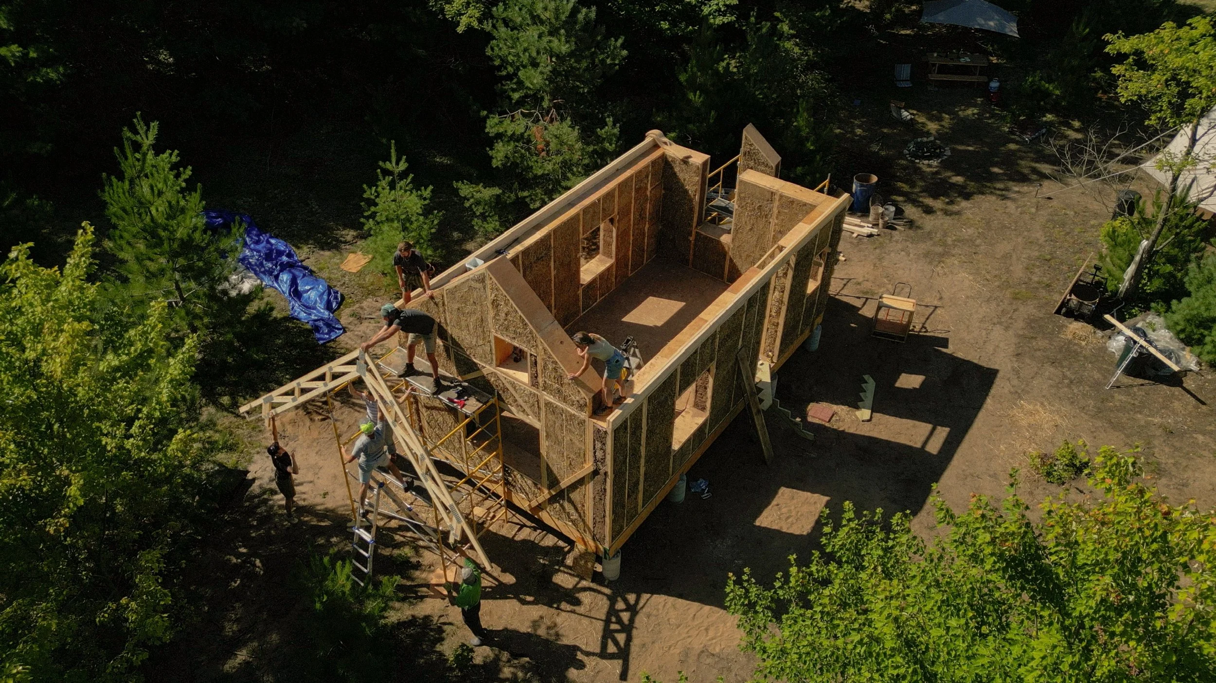 The straw panel cabin at Another Place is an experimental building project exploring how architecture can emerge from local agricultural waste, collaborative design, and ecological care. Designed by Elle Gover and Ellen Rutt in collaboration with Bale Craft, the cabin is Michigan’s first permitted structure built with prefabricated straw panels — demonstrating a viable path toward low-carbon, healthy construction.