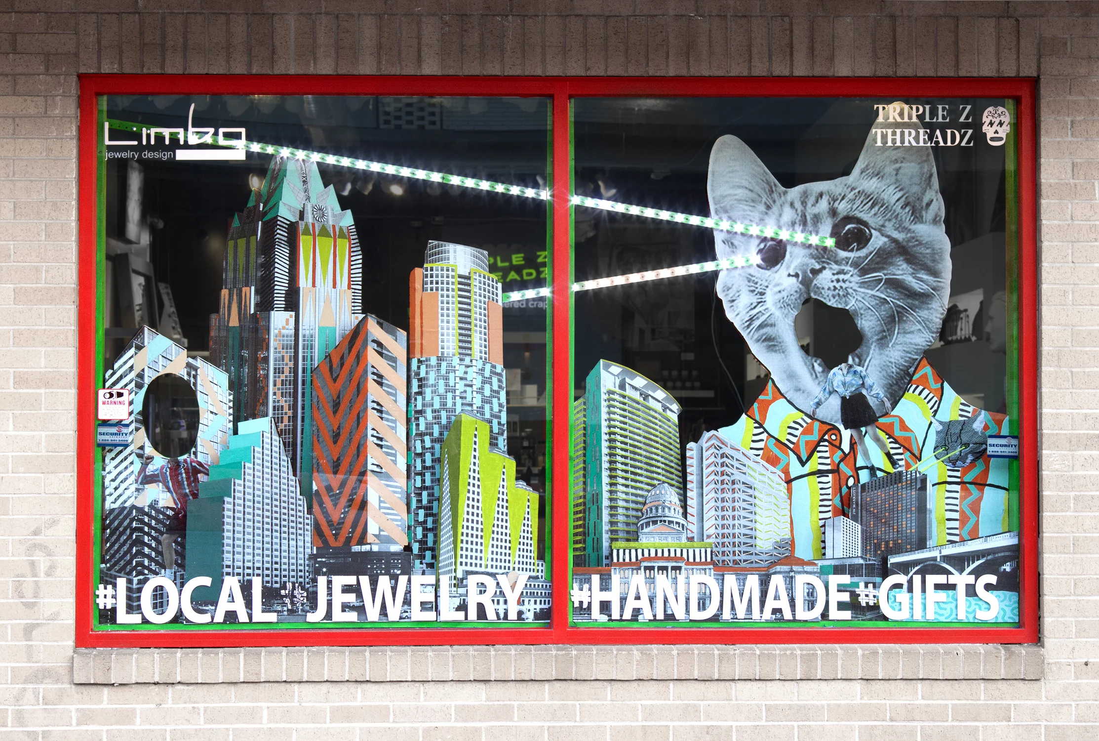 No one saw it coming, but in the summer 2015, the laser cats descended upon Austin, Texas. This window installation is a tribute to those who weren't so lucky.