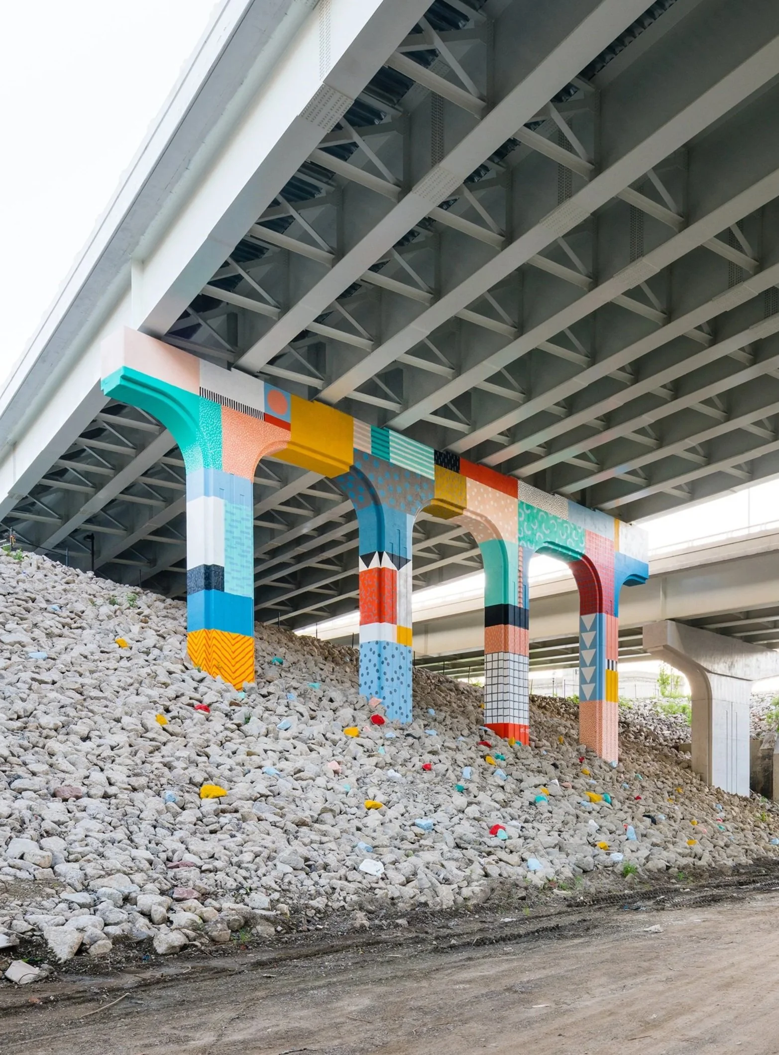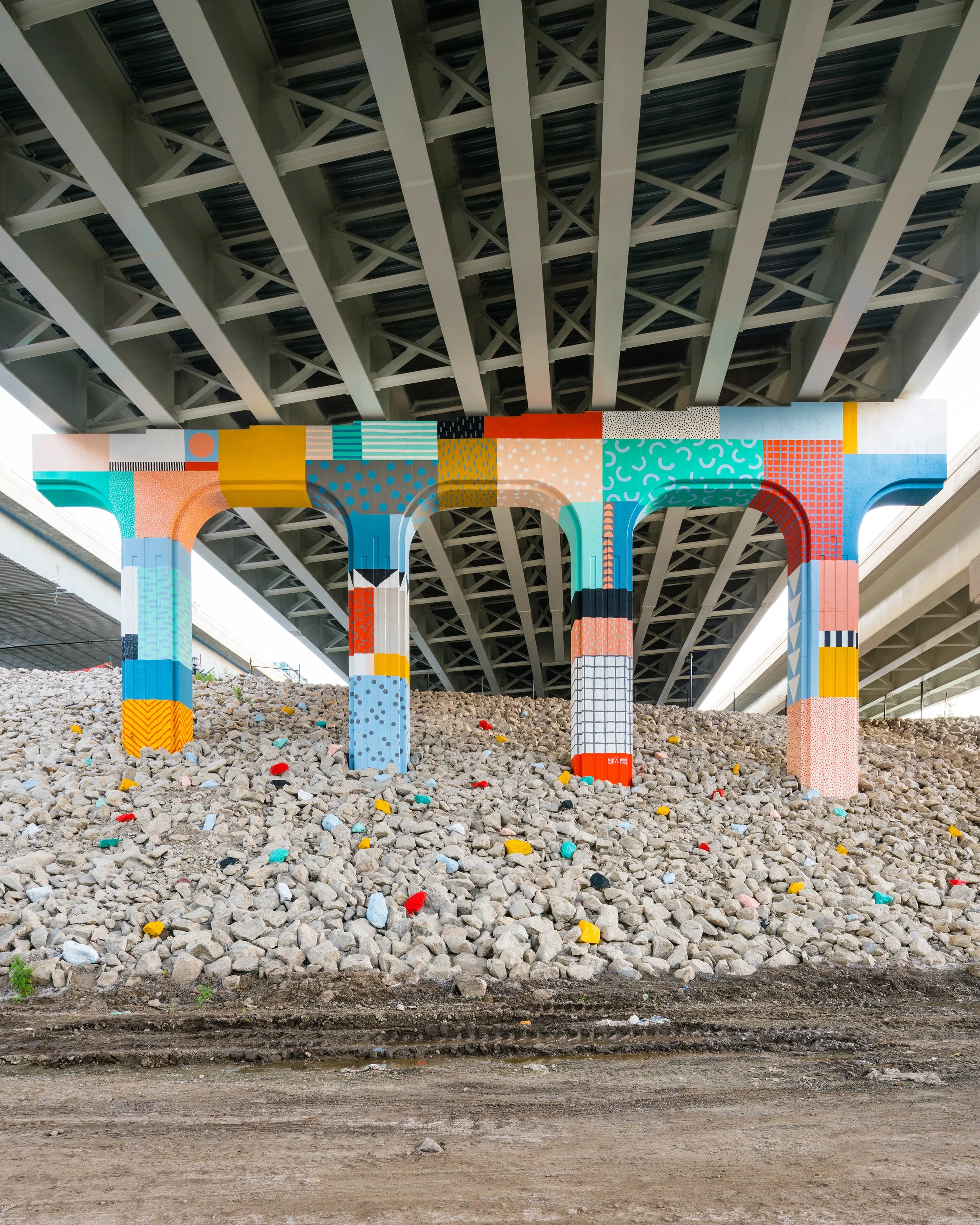 Patchwork Cleveland is a mural I hand-painted and on a highway overpass, visible only from the pedestrian path and adjacent train line. Created as part of INTER | URBAN, a public art initiative produced by LAND studio with regional partners, the work draws from quilt patterns and the language of patchwork. The quilt—an emblem of slow, quiet handwork—appears to hold up the city above, suggesting that what sustains urban life is often unseen: the labor, care, and craft made by many hands.